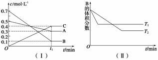 T ℃时,A气体与B气体反应生成C气体,反应过程中A、B、C浓度变化如图(Ⅰ)所示,若保持其他条件不变,温度分别为T1和T2时,B的体积分数与时间的关系如图(Ⅱ)所示。
