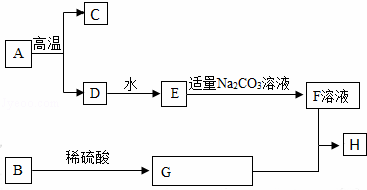 下列框图中的物质均为中学化学常见物质,其中A是大理石的主要成分,B是黑色粉末,H是蓝色沉淀.如图是它们之间的转化关系,请回答.