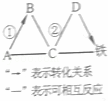 A、B、C、D分别为氧化铁、盐酸、氢氧化钙、碳酸钙中的一种.它们之间的反应或转化关系如图(部分物质和反应条件已略去).则化学方程式:① .② .A在生产或生活中的一种用途是 .