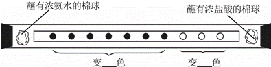 取一滤纸条,等间距滴入10滴紫色石蕊溶液,装入玻璃管中,然后从玻璃管的两端同时放入分别蘸有浓氨水和浓盐酸的棉球,并迅速封闭两端管口,很快可观察到管内有白烟产生,待白烟消失后还可观察到如图所示的现象.