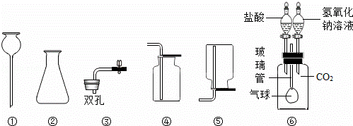 (4)利用如图⑥所示装置(集气瓶中预先装满CO2气体)来验证CO2的性质,先加入足量氢氧化钠溶液,观察到的现象是气球 (填“变大”、“变小”或“不变”).反应方程式为 ;再加入足量盐酸,观察到的现象是气球 (填“变大”、“变小”或“不变”).