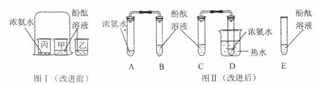 图I是按课本进行的一个化学实验,大烧杯中的实验现象是_______ ____,此实验说明分子______________________。但是在实验时同学们闻到了一股难闻的刺激性气味,于是小明对原实验装置进行了改进,装置如图Ⅱ,并进行如下操作: