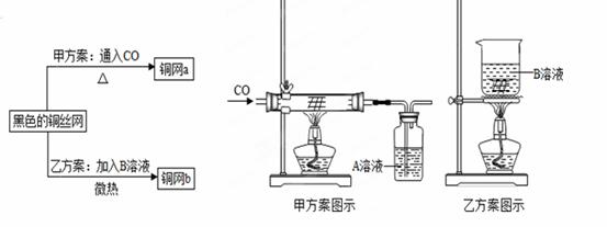 通过红热的铜丝网后,发现铜丝网表面变黑.在研究如何除去表面的黑色物质,回收再利用铜丝网的讨论中,制定了下列方案.下列说法正确是![]()
