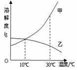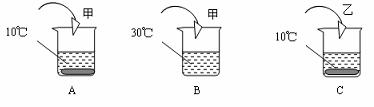 .A、B、C三个烧杯中盛有相同质量的水(其中A、C烧杯中水温为10℃,B烧杯中水温为30℃,不考虑溶解过程中温度的变化),分别加入甲、乙两物质各10g,充分溶解后所得现象如下图所示,试回答: