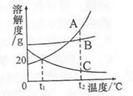 (1)溶解度随着温度升高而增大的是 物质,t1℃时A、B两种物质的溶解度为 g.