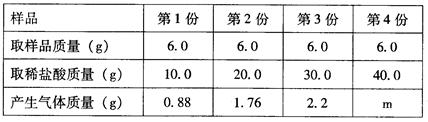 (5分)某同学为了测定石灰石样品中碳酸钙的质量分数,取四份样品分别和稀盐酸反应,其实验数据记录如下表。(杂质既不溶于水也不跟酸反应)![]()