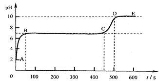 (4)块状石灰石和适量稀盐酸反应至气泡逸出不明显后,测得其残留液pH等于2。此时取适量反应后溶液,逐滴滴入碳酸钠溶液,并用pH数字探测仪连续监测,得曲线如下[pH为纵坐标,时间s(秒)为横坐标]:![]()