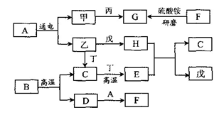 学习化学要求熟悉物质的性质以及物质之间的相互转化。以下框图中的物质均为初中化学中的常见物质,其中甲、乙、丙、丁、戊均为单质,常温下,丁为黑色固体,戊为紫红色金属。农业上常用F改良酸性土壤。常温下,G是一种具有刺激性气味的气体,其水溶液显碱性,工业上用甲和丙化合制备G。![]()