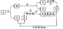 (6分)有关物质的转化关系如右图所示,其中A为一常见的有机物,在通常情况下,X、Y为两种气态单质,Z为固态单质,B、C、D为三种常温下状态各不相同的氧化物(个别反应的条件未注明)。![]()