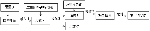 (7分)某校化学兴趣小组用氯化钠固体(含少量CaCl2杂质)来配制一定质量分数的NaCl溶液,实验的流程图如下: ![]()