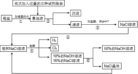 以电解食盐水为基础制取氯气、氢氧化钠等产品的工业称为“氯碱工业”,它是目前化学工业的重要支柱之一。由于粗盐中含有少量MgCl2、CaCl2、Na2SO4等杂质,不符合电解要求,因此必须经过精制。以粗盐为原料的“氯碱工业”流程如下:![]()