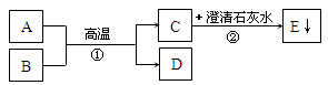 (6分)已知A、B为两种黑色粉末,D为红色单质。A、B、C、D、E五种物质之间的转化关系如下图所示。![]()