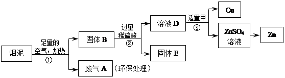 某金属冶炼厂的管道烟泥中含有某些单质,其中Cu约占10.3%、Zn约占5.0%、S约占1.2%。现欲回收铜和锌,并对硫进行环保处理,主要步骤如下图所示:![]()