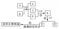 右图表示某些物质间转化关系(反应条件和部分产物已省略)。其中A、E为固体氧化物,且A为黑色粉末;B、D是由相同元素组成的无色液体,且B具有消毒杀菌作用;C、Y、Z为无色气体,其中Y有毒;X是最常见的金属。请回答下列问题: ![]()