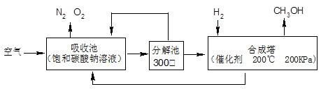 有人提出工业生产回收利用空气中CO2的构想:把空气吹入饱和碳酸钠溶液中,溶液可吸收CO2生成碳酸氢钠;加热碳酸氢钠固体又分解放出CO2;在合成塔内CO2与氢气反应生成甲醇(CH3OH)和水。简要的生产流程如下图所示:![]()