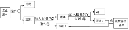 有一种工业废水,其中含有大量的硫酸亚铁,少量的银离子以及污泥。某同学设计了一个既经济又合理的方法回收银和硫酸亚铁晶体。方案流程如下:![]()