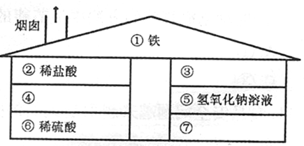 (6分)如右图所示,某兴趣学习小组的同学根据“上下相邻的物质间均可发生化学反应,且左边上下相邻物质间反应均有气体产生”的游戏规则,以玩“盖房子”的游戏方式来学习几种重要物质之间的有关知识。![]()