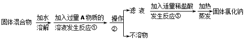 (4)反应①中加入过量A物质的目的是 ;反应③中如果加入盐酸也过量,则对所得到的氯化钠纯度是否有影响?理由是 。