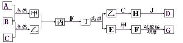 在下面关系图中,A、B、C、D是初中化学中常见的单质,甲、乙分别是酒精燃烧时一定会产生的两种物质,丁是建筑材料的主要成分,G为无色有刺激性气味的气体,能使紫色石蕊变蓝,J是赤铁矿的主要成分。![]()