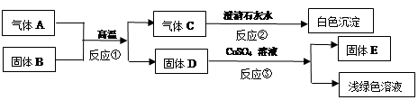 如图,A、B、C、D、E是初中常见的五种物质,其中气体A与C组成元素相同,B和E是红色固体,D为黑色粉末。(部分生成物未标出)![]()