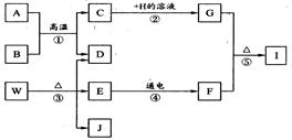 A~J分别是初中化学中常见的物质,它们存在如下转化关系。其中B、D、F、J均为无色气体且J能使湿润的红色石蕊试纸变蓝,A为红棕色固体,W是常见的一种化学肥料,E在常温下为无色液体,H的溶液呈蓝色。(反应中的个别生成物已略去)![]()