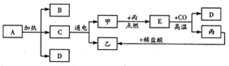 (2012·德阳)下图是初中化学中常见物质间的转化关系,其中甲、乙、丙为单质,A、B、C、D、E为化合物,A在食品工业上是发酵粉的一种主要原料,D是使地球产生温室效应的一种气体,丙是生产生活中占据主导地位的金属。(图中部分生成物已略去)![]()