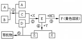 右图表示某些物质间转化关系(反应条件和部分产物已省略)。其中A、E为固体氧化物,且A为黑色粉末;B、D是由相同元素组成的无色液体,且B具有消毒杀菌作用;C、Y、Z为无色气体,其中Y有毒;X是最常见的金属。请回答下列问题:![]()