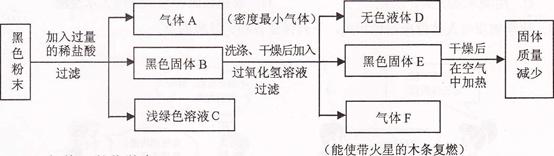 现有一包黑色粉末,可能含有铁粉、木炭粉、二氧化锰中的一种或几种。请根据以下实验流程图进行推断,并完成以下内容:![]()