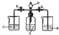 (3)若A~D均由三种元素组成,且有如右图所示的实验,C、D含有相同的金属元素。若关闭K2打开K1,将D中溶液滴入A中,可观察到产生大量气泡,B中溶液变浑浊;此时关闭K1、打开K2,可观察到广口瓶中液体进入C中,发生反应但无明显现象。则D为 ,B→C的化学方程式为 。![]()