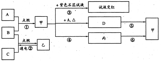 (15分)在下面关系图中,A、B、C是初中化学中常见的单质,甲、乙分别是酒精完全燃烧时一定会产生的两种物质,丙是鸡蛋壳的主要成分。请回答下列下列问题:![]()