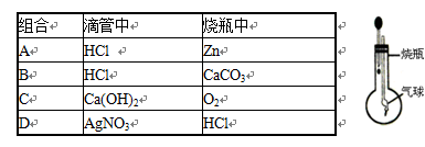 探究小组利用下图装置进行四组实验,胶头滴管盛装的是液体,烧瓶中盛装的是气体、固体或液体,当胶头滴管滴几滴液体后,能观察到气球变大的实验组合是( )![]()
