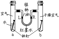 右图是探究铁锈蚀条件的装置。调节L端与R端的液面高度一致,塞紧木塞,一周后观察。下列推断错误的是![]()