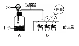 下图中A与B两装置分别表示种子和幼苗进行的生理作用,A、B装置间用玻璃管连接。请据图回答:![]()