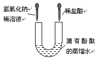 U形管中是滴有酚酞试液的蒸馏水,向左.右两管中分别同时逐滴滴加一定量的氢氧化钠稀溶液和稀盐酸(如图所示)。下列说法正确的是![]()
