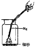 在集气瓶内放入一装有少量酒精(C2H5OH)的蒸发皿,先点燃蒸发皿内的酒精,再将经打磨过的光亮镁条伸入集气瓶内点燃。可看到镁条剧烈燃烧,在瓶底白色固体粉末中夹杂着少量黑色固体,瓶内壁也附着一些黑色固体。(如右图)甲同学将生成物取出,用足量的盐酸处理,结果发现白色物质溶解,黑色物质不溶。由此他猜测:黑色物质是原来镁条中所含的杂质。