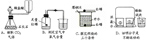 (5分)下列A~D是初中化学中的四个实验装置,请按要求填空:![]()