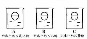 如下图所示,将鸡蛋放在三种液体中进行实验,最终鸡蛋下沉的是 。(填序号)![]()