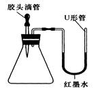 若将胶头滴管中的物质滴入锥形瓶后,能明显观察到U形管中红墨水的液面左低右高,甚至从右端溢出。请推测胶头滴管和锥形瓶中的物质分别是什么?(答出两种组合即可)![]()