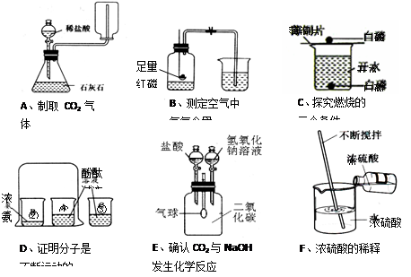 (13分)下列A ~ F是初中化学中的六个实验,请按要求填空:![]()