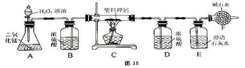由于大量使用一次性塑料方便袋而造成的“白色污染”已成为一个严重的社会问题。某化学研究小组的同学对某种塑料袋的组成进行分析研究(资料显示该塑料只含C、H两种元素)。他们设计了图18所示的实验装置,使该塑料试样在纯氧中完全燃烧,观察实验现象、分析有关数据、推算元素含量。![]()