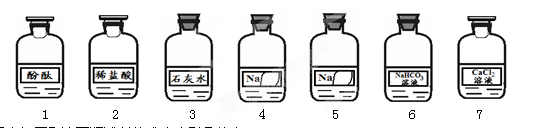 化学兴趣小组同学发现实验台上按如下顺序摆放着7瓶不同的无色溶液(如图所示),其中4、5号试剂瓶标签破损。![]()