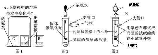 【问题情景】在课外活动中,小斌按照课本实验(见图1)探究微粒的性质时,闻到了刺激性的氨味,于是,小斌在老师的指导下,设计了如图2的实验装置,进行同样的实验,结果不再有刺激性的氨味,并且快速出现实验现象,得到了和课本实验同样的结论。![]()