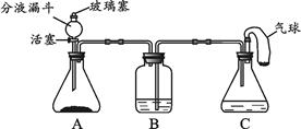 (5分)化学小组同学用下图所示装置(夹持仪器已略去)做兴趣实验。分液漏斗及C装置中所盛放的溶液相同,B、C装置中盛放的溶液足量,气球中装有少量的白色固体粉末。![]()