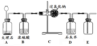 (5分)过氧化钠(化学式为Na2O2)能与CO2反应,化学方程式为2Na2O2 + 2CO2 =" 2Na2CO3" + O2↑,可用在呼吸面具中作为氧气来源。某实验小组欲用干燥的二氧化碳与过氧化钠反应收集一瓶氧气,实验装置如下图所示,请回答问题。![]()