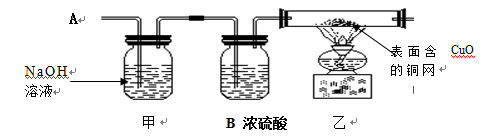 [实验探究]小组同学首先称量装置甲的质量,再将收集的气体从A通入,过一会儿后点燃乙处的酒精灯;一段时间后,发现表面含有CuO的铜丝网变为光亮的红色;此时先 (填“停止加热”或“停止通气体”);实验结束时称量装置甲的质量,发现质量无变化.
