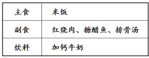 化学与生活密切相关。小明要参加期末考试,他妈妈为了给他增加营养,制定了如下表所示的食谱。![]()