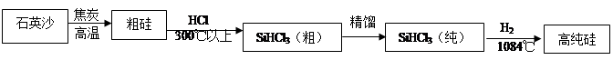 (6分)作为推行“低碳经济”的重要科技进步,太阳能 光伏发电成为2010年上海世博会的“亮点”。太阳能光伏发电最关键的材料是高纯硅。三氯甲硅烷(SiHCl3)还原法是当前制备高纯硅的主要方法。生产流程示意图如下:![]()