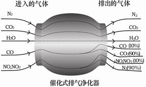 (3)为了降低汽车排放的尾气对空气的污染,现在的大部分汽车都安装了催化式排气净化器。右图列举的是几种气体在净化器中转换前后的变化。![]()