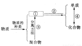 下图表示物质分类、分离和转化关系,请根据图示信息要求填物质类别、分类标准、分离方法、变化类型: