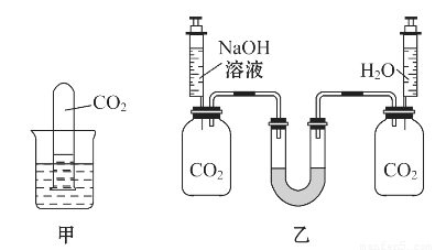 实验二:如图乙,向两个装满二氧化碳的同样规格的瓶中分别注入等量的氢氧化钠溶液和蒸馏水,振荡后放在水平的桌面上,观察U形管(装有红墨水)两端液面的变化情况。请问: